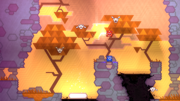 Sounds easy enough, right? Initially this is indeed the case, as your main challenge is timing your jumps correctly so that neither character falls down or onto a spike – as these are not placed in the same spot for each totem piece. The way the levels are designed, Press Play quickly introduces you to other challenges as well. For instance – the way in which the two characters are aligned might mean that a jump results in one of them jumping to safety, with the other one going head first into a spike. The solution? Backtrack into a wall with one character while the other is still able to move – changing the alignment between the two characters and allowing them to both make the jump.