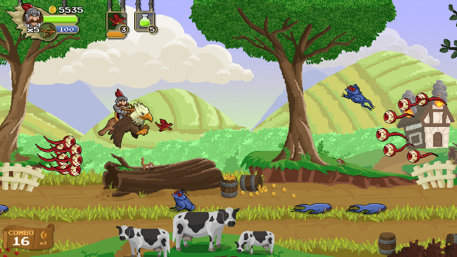 This illustrates how popular the shoot ’em up genre was back in the day, and side-scrolling 2D shooters were the norm (3D wasn’t really around, and vertical scrollers like Xenon were an exception). Gryphon Knight Epic was made for all those gamers who fondly remember those days, as well as those who were captivated by them years later. Its closest relative – thematically speaking – is perhaps Pegasus by Gremlin software, a game probably only known to gamers who owned an Atari ST or Amiga. In that game, you played a knight who rode on the back of a pegasus – a winged horse. In Gryphon Knight Epic – you guessed it – you ride on the back of a gryphon, a half-eagle, half-lion. Pegasus also featured platforming levels though, whereas Gryphon Knight Epic is purely a shooter.