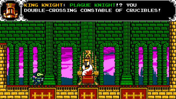 Plague of Shadows isn’t a direct follow-up or a completely separate chapter – you play though many of the same levels that Shovel Knight went through, but with a distinctly different flavor this time. Non player characters obviously treat you very differently, and the array of skills and weapons you have at your disposal are just as different. Where Shovel Knight was all about ‘in your face’ combat and the occasional ‘bounce of death’, Plague Knight is bomb thrower. These bombs aren’t a one size fits all weapon – they can be configured and upgraded throughout the course of the adventure.