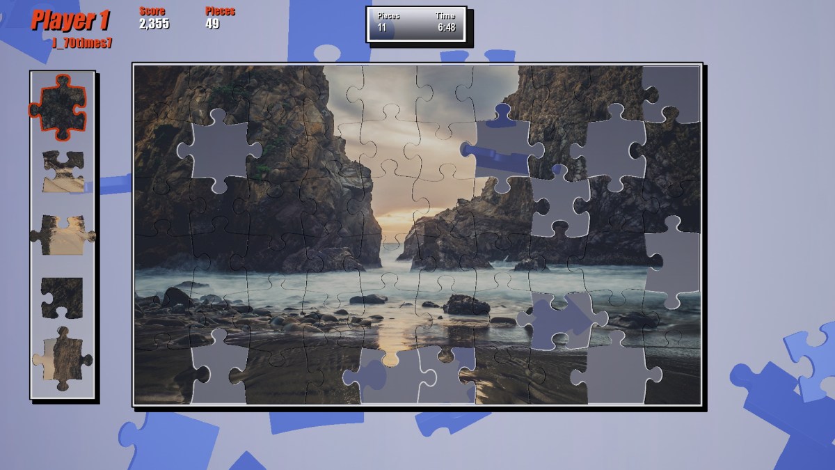 In additional to traditional puzzle solving, you can also engage in a multiplayer mode, where up to four players are all working on the same puzzle trying to get the best score. You always have a limited amount of jigsaw pieces readily available, and scoring extra points can be done by placing your pieces fast and/or by making very few (or no) mistakes. Since it’s such an easy format to pick up, things quickly and easily become competitive – there is no real advantage for existing Puzzle Showdown 4K players here.