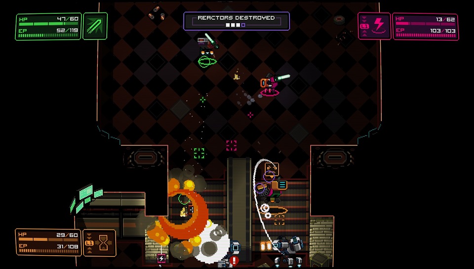 The game is essentially a twin stick shooter, but one with a few (loot-fueled) RPG and rogue-like elements included. You have a choice of three robot types, each with their own unique skills to help you through the game’s twenty or so levels. One focuses on attack, another on shields, with the third one being especially good at evasion through a dashing move. You also have the ability to add another special move prior to jumping into the gameplay, but these moves aren’t exclusive to any specific robot and can be selected no matter your choice of robot (and playing style). I personally enjoyed enabling auto-heal for my offensive character, so I could get away with my reckless playing style for a while – but ended up switching to something else entirely in the later stages of the game.