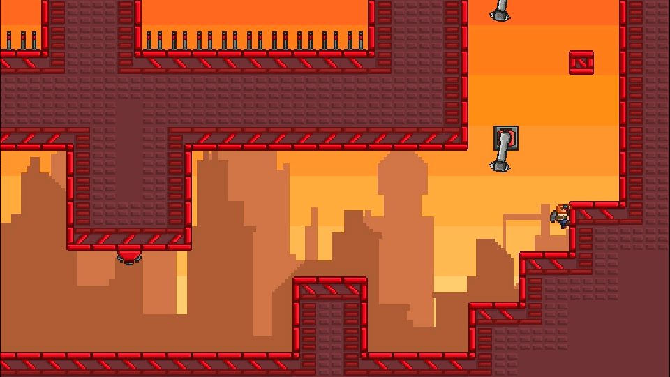 League of Evil’s visuals are slightly more zoomed in than Super Meat Boy’s, allowing for larger sprites but showing you less of the level at any given point. The art design is very “retro” though, so despite the more zoomed in look you’re not seeing a ton of detail and will be jumping around tons of squares and surfaces with 90 degree edges. It’s a look that makes for plenty of contrast though, which helps in timing your jumps even if it means that backdrops don’t look very exciting. On the audio front, League of Evil has a nice chiptune soundtrack that goes well with its visual style.