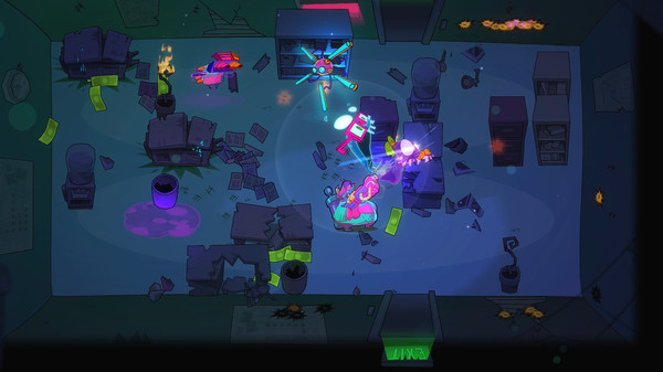Dead End Job is a colorful 2D twin stick shooter with visuals that were clearly inspired by cartoons – its creators credit Ren & Stimpy as a source of inspiration. Think Ren & Stimpy meets Ghostbusters and you’ve got a pretty good idea of what you’re getting. This doesn’t just stop at the visual style, but also translated to a lot of silly humor, which makes this a lighthearted and fun game rather than a suspenseful ghost-filled romp. Levels are randomly generated each time, but you have one room on screen at the same time so you never lose that “sweeping the building room by room” feel – though building layouts change and you can dynamically tackle the order in which you clear rooms.