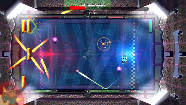 The development of Wreckout grew from the desire to build a game around a novel, physics-based mechanic. For the first prototype, which featured a top-down view of a car in a desert, lead programmer Jonathan Port started by focusing purely on the handling of the vehicle, making it nimble and agile like old-school Micro Machines cars. He also implemented a grapple chain which could latch on to enemy bots and engage in a tug-of-war mechanic. While the grappling felt satisfyingly tactile right away, the tug-of-war aspect worked against the nimble handling of the vehicle. We discussed it and thought that grappling onto a light-weight dynamic object like a ball, which could then be flung around, might feel more exciting. It worked, but the open desert environment meant there was a slow turn around between slinging the ball and driving off to collect it again. The ball instinctively made us think of sports, so we decided to run with that theme by moving the action into a Speedball style arena with a goal at either end, adding two-player support in the process. Again this felt like a leap forward but using goalposts was disruptive to the tempo since the game had to reset each time a player scored. We wanted a more tennis-like tempo so we took inspiration from Breakout and implemented the bricks. This was the eureka moment when everything suddenly clicked and we knew we’d found the magic. Everything since has really been about refining this core concept.