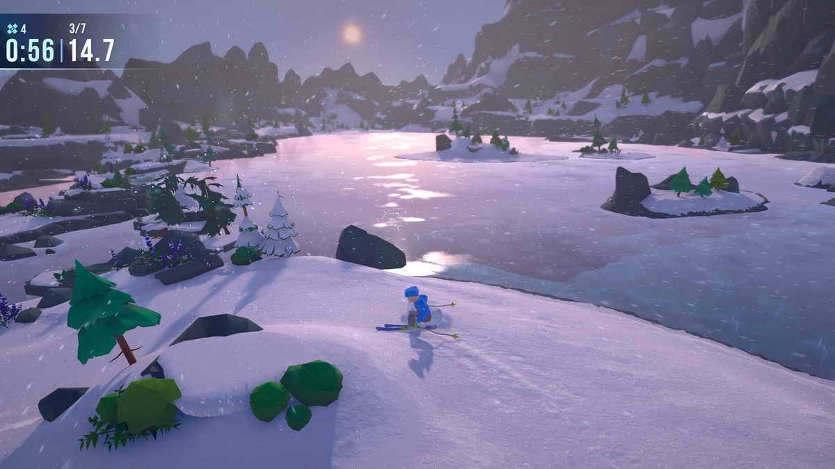 At its core, Snow Riders retains the series’ signature gameplay loop of navigating treacherous terrain and perfecting your path down the mountain. The addition of snowy environments, from dense forests blanketed in snow to icy lakes that test your control, adds a fresh aesthetic and mechanical twist since you’re not on skis. The snow’s impact on traction and speed makes the descent feel different from the dirt trails of previous entries, demanding new strategies and, at times, tighter precision. This change keeps the gameplay engaging for returning players, though the steeper learning curve may frustrate newcomers at first – and you might want to pick up Downhill first. It’ll give you a good idea, it might be on sale, and it’s a great game.