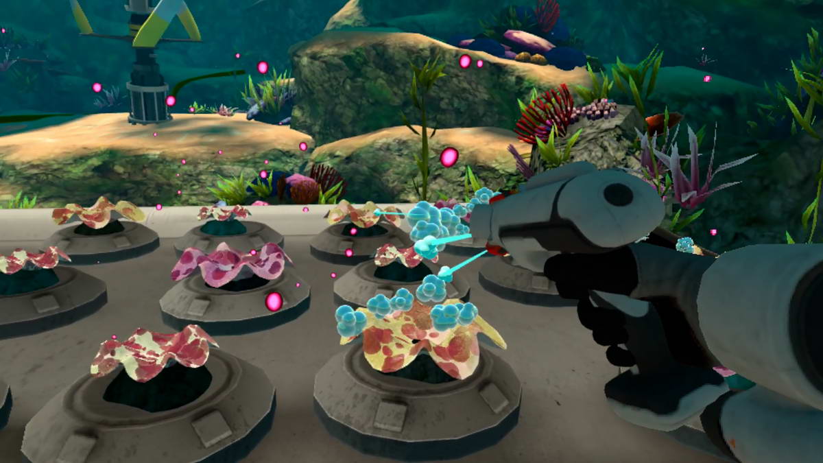 The VR adaptation provides an immersive oceanic setting, but movement mechanics leave something to be desired. Players are restricted to using analog stick navigation or hand propellers, rather than natural swimming motions. While this design choice prioritizes comfort, it diminishes the potential for a more engaging movement system. Additionally, the enforced vignette effect during movement, which cannot be disabled, may frustrate experienced VR users who aren’t in need of comfort options like that. The lack of physical interactions further limits immersion – players can’t touch or interact with marine life directly, and tools materialize from thin air instead of being visible on the avatar’s body.