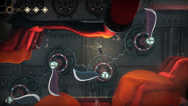 Where MIO immediately impresses is in its visual identity. Across every biome of the Vessel, hand-drawn backgrounds, watercolor-inspired palettes, and layered artistic textures give each area a unique personality that feels more like a moving graphic novel than a traditional platformer. The interplay of mechanical ruin and organic resurgence, from frozen caverns to overgrown halls, reinforces the sense of narrative decay and wonder. This art direction translates into crisp performance and fluid animation, allowing traversal and exploration to feel purposeful and immersive. The soundtrack supports this vision as well, alternating between contemplative atmosphere and kinetic energy during encounters, underscoring the game’s emotional tone without overpowering it.