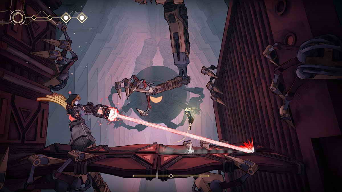 Where MIO immediately impresses is in its visual identity. Across every biome of the Vessel, hand-drawn backgrounds, watercolor-inspired palettes, and layered artistic textures give each area a unique personality that feels more like a moving graphic novel than a traditional platformer. The interplay of mechanical ruin and organic resurgence, from frozen caverns to overgrown halls, reinforces the sense of narrative decay and wonder. This art direction translates into crisp performance and fluid animation, allowing traversal and exploration to feel purposeful and immersive. The soundtrack supports this vision as well, alternating between contemplative atmosphere and kinetic energy during encounters, underscoring the game’s emotional tone without overpowering it.